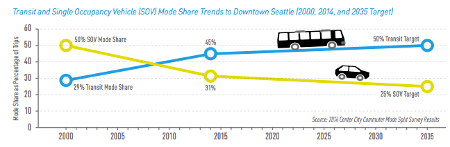 When voters last November approved the Levy to Move Seattle, one of its goals was reducing commute mode share in Downtown Seattle of single-occupancy vehicles (SOVs) to 25% and increasing the mode share for transit riders to 50%.
