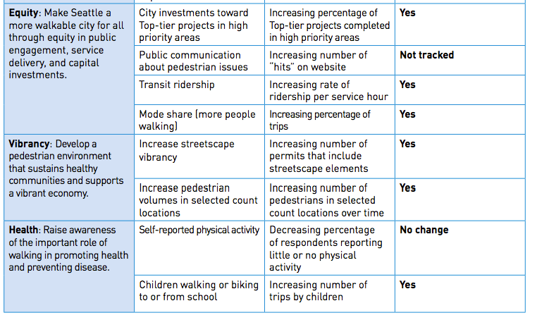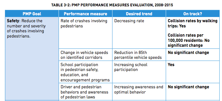 There are a number of really great objectives laid out in the PMP, from education in street safety at schools to increasing streetscape vibrancy to people simply getting more exercise. Many of these goals have been measured since 2008 but very few of these goals have a concrete target that success could be measured by.