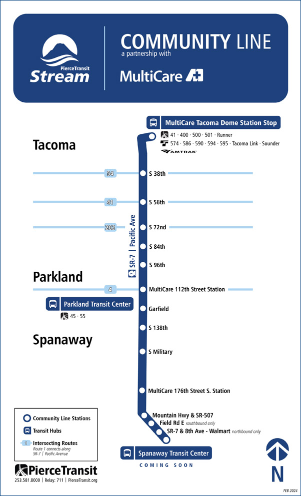 Pierce Transit has announced a launch date of April 1 for its newest transit offering, the Stream Community Line. A peak-hour service that will shadow existing service on the Route 1 between Tacoma Dome Station and Spanaway, the Community Line will run every 20 minutes from 5:30am to 7:30am and from 4pm to 7pm, only stopping at the most frequently-used stops along Pacific Avenue and Mountain Highway.