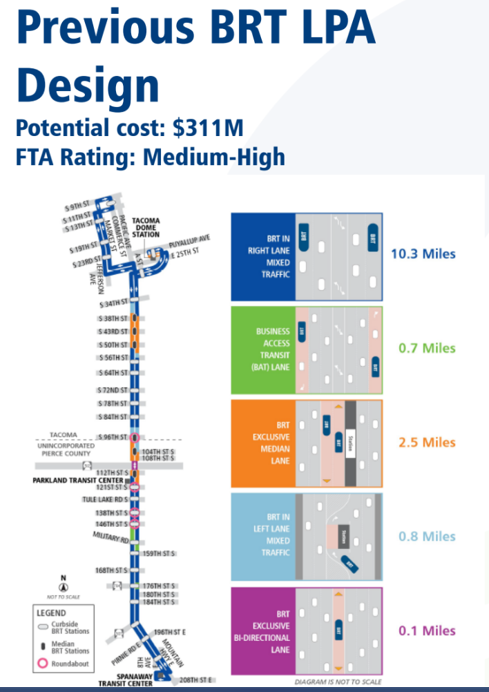 Bus rapid transit (BRT) along Pacific Avenue/State Route 7 in Pierce County is no longer feasible, according to Pierce Transit. The agency’s board met on August 14th and voted to effectively end the project as it was proposed and planned, promising “Enhanced Bus Service” along a stretch of the original BRT route instead.