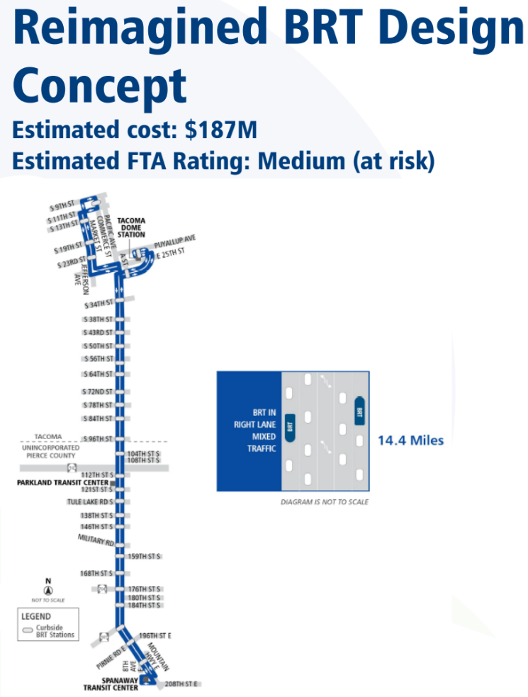 Pierce Transit will now have to radically rethink how it can deliver more frequent, reliable transit along the corridor, as the latest cost estimates for the current design have been pegged at $311 million, over $100 million more than the agency has identified as potentially available. That funding includes $22 million from the agency itself, $60 million from Sound Transit, and more than $26 million in state transportation funding. But it also includes a potential $75 million grant from the Federal Transit Administration (FTA) that may be at risk if the agency pulls elements from the project that ensured ridership gains.