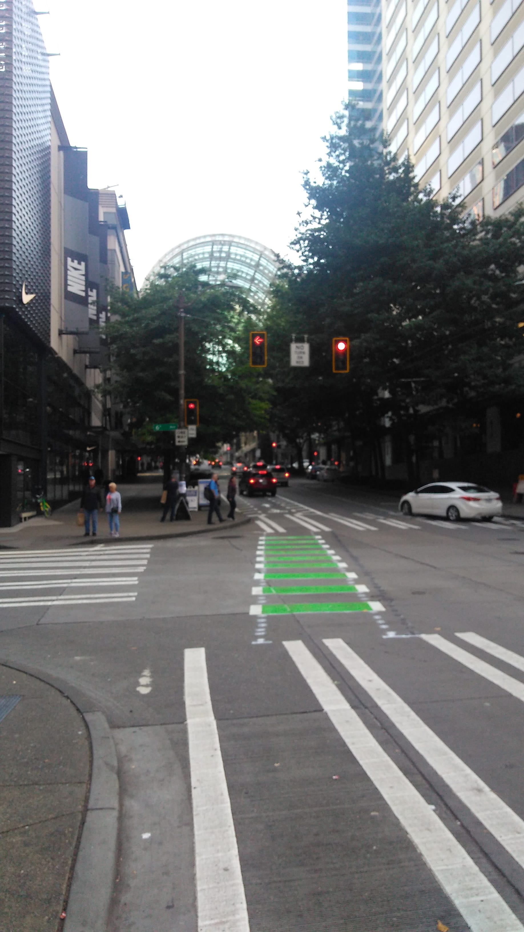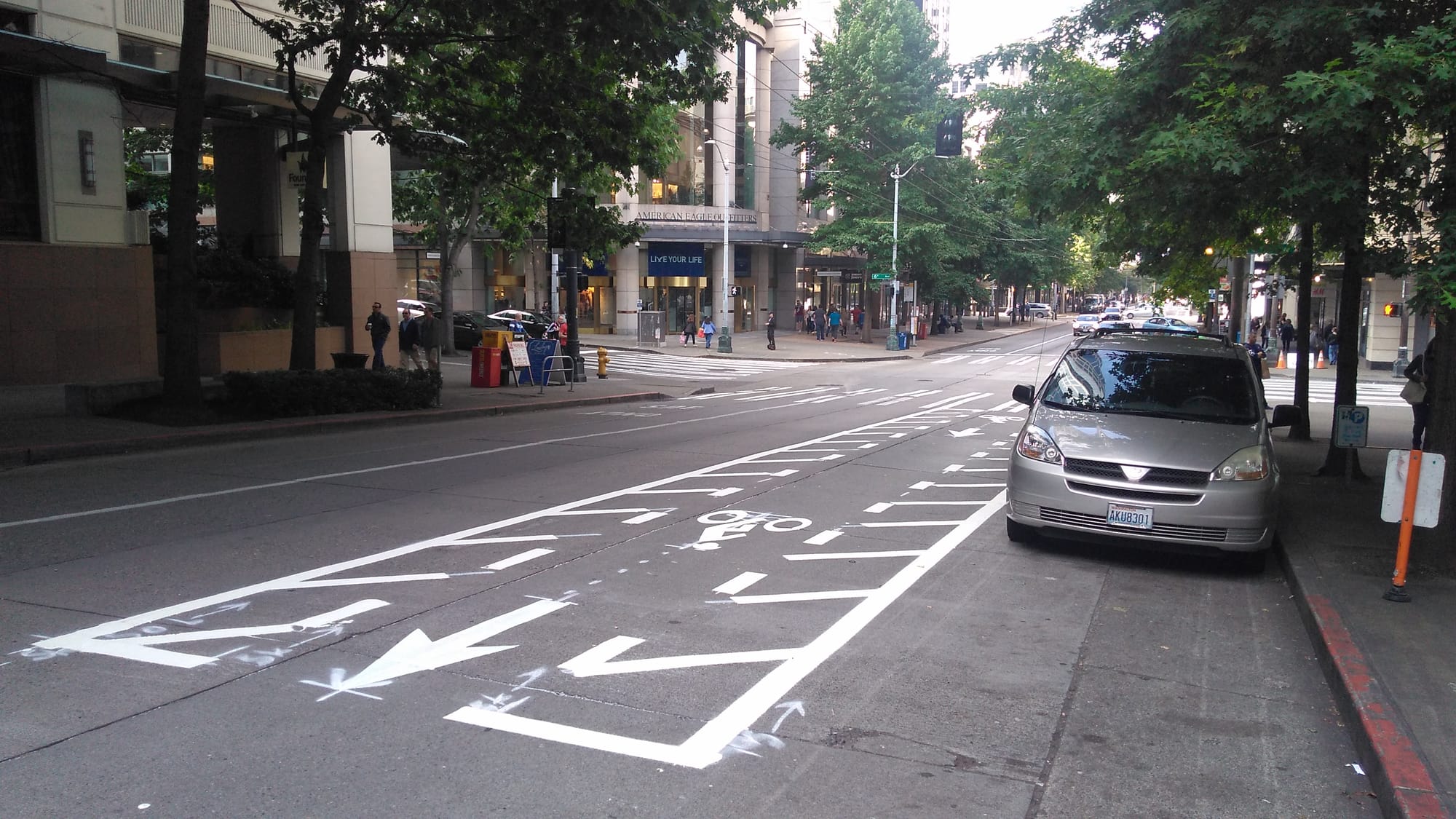 Pine Street is another matter. For riders coming from Capitol Hill, currently you have to cross the entirety of Pine to get from the painted bike lane on the right side coming down the Hill to the start of the protected lane on the left. This happens directly in front of the Hyatt hotel where there are likely to be a lot of vehicles entering and exiting the driveway. In addition, when you get to Fifth Avenue, cyclists are forced to merge into the shared space of Westlake Plaza. Any changes to the decorative tiles were essentially off the table in order to separate the modes, so this is what we are left with. The only silver lining with this merge is that the leftmost travel lane is now a turn-only lane, so cyclists should have a lane to themselves with traffic going straight on the right side lane.