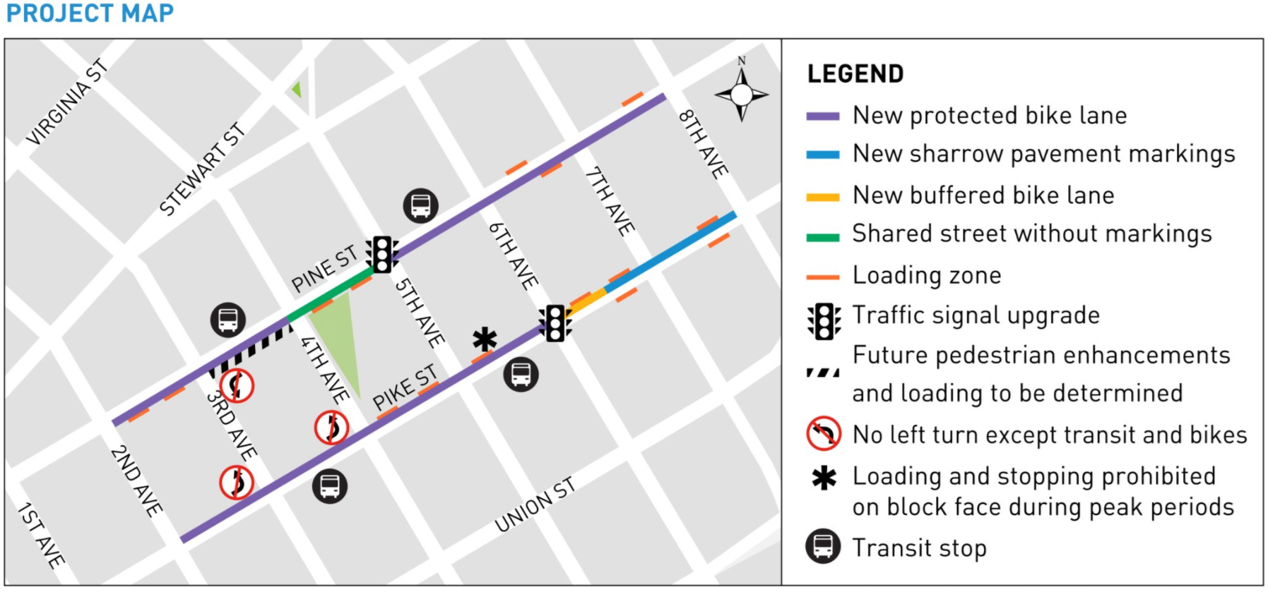 The protected bike lanes on Pike Street, which would take users up to Capitol Hill eastbound in the direction of traffic, are proposed only between Second and Sixth Avenues. After Sixth Avenue, riders would travel in a buffered bike lane for an additional half block, after which point the bike lane would disappear, with riders sharing the lane with traffic. Seventh Avenue will be getting a one-way protected bike lane of its own by next year, and at that time vehicle turns would be restricted from Pike Street onto Seventh Avenue. Restricting turns now would allow the bike lane to be extended to Seventh Avenue.