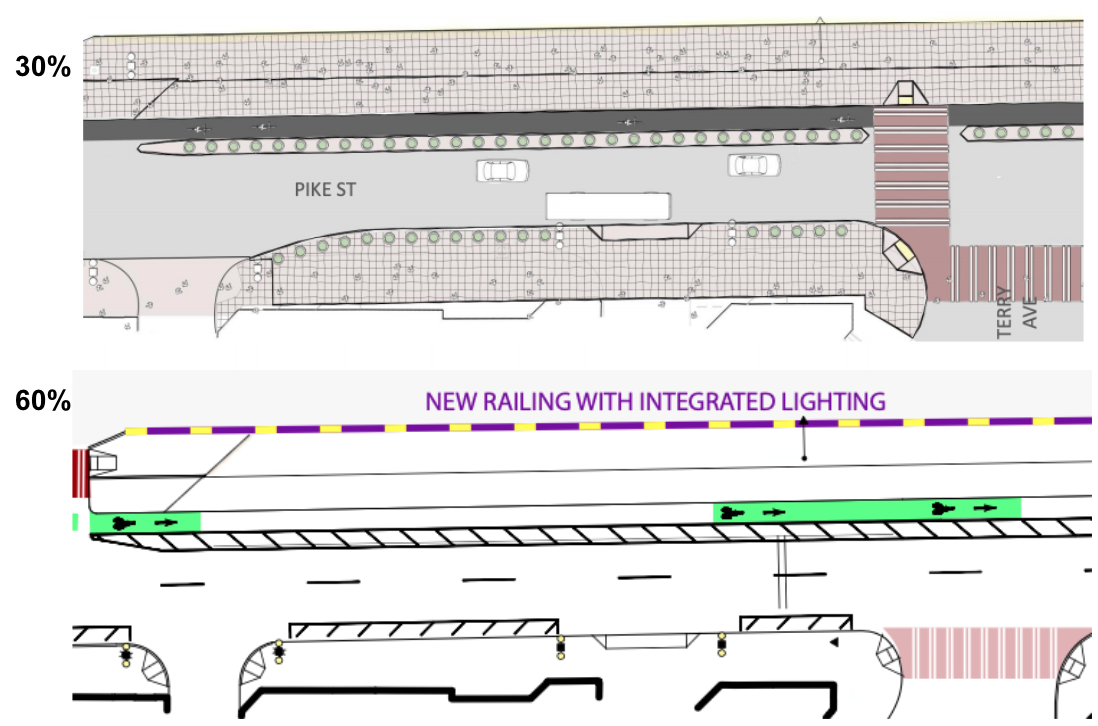 One of the biggest changes since the last set of designs was released last year: wider sidewalks and concrete bike lane barriers have been removed from the project on the Pike Street bridge over I-5. The city’s transportation department Media and Public Affairs Lead Ethan Bergerson told us that the reason for the change is the added weight.