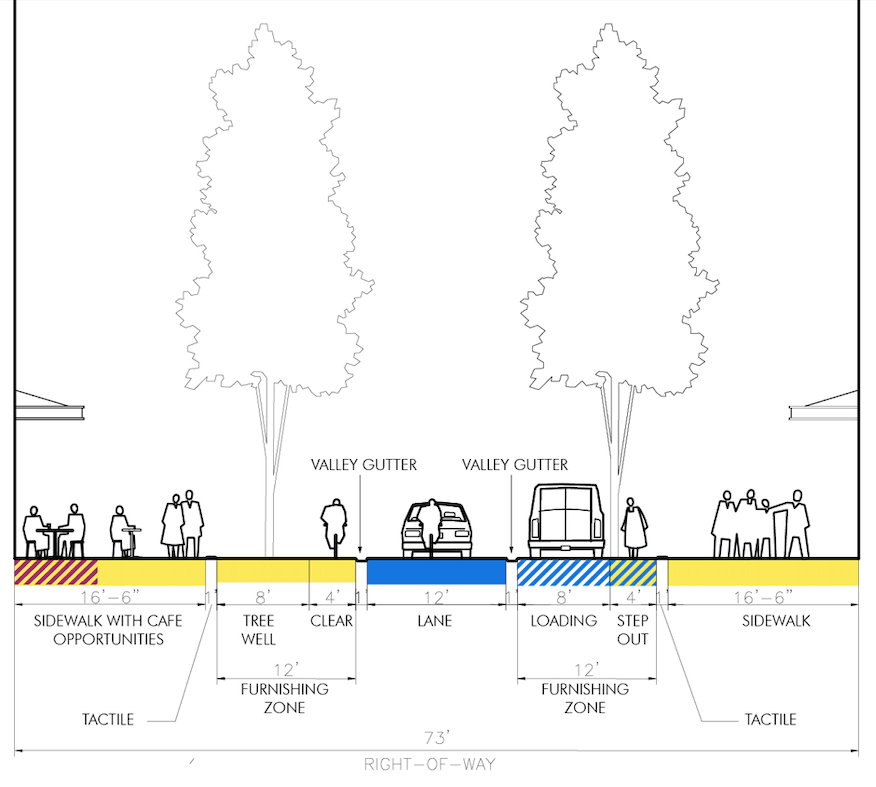 The renderings depict someone riding a bike between the gutter and the tree well on one side, presumably to ride against the direction of traffic, but the sidewalk will be a much safer option for someone doing that. Wider sidewalks will be nice here, but this is just a missed opportunity in every way for the type of pedestrian street Seattle needs more of. We’re told shared streets are all the rage in Europe, but this isn’t how to do it.