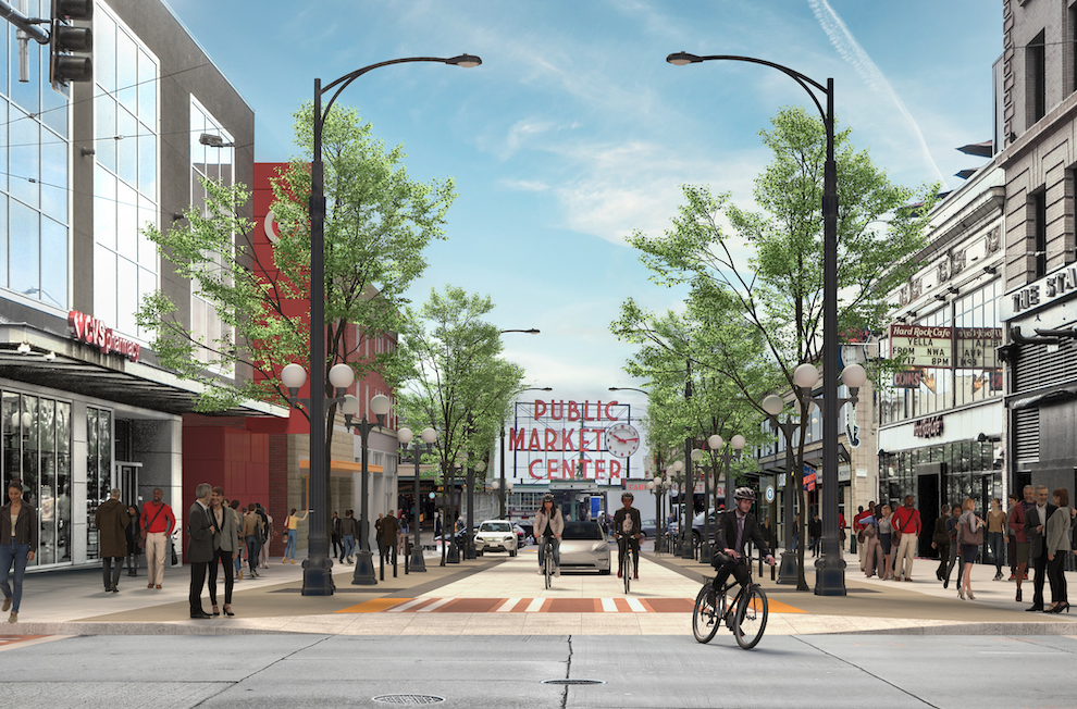 The planned overhaul of the Pike Pine corridor in downtown Seattle will undoubtedly become one of the most significant changes to Seattle’s retail core since perhaps the opening of Westlake mall and park in the late 1980s. The approximately $40 million revamp, dubbed the Pike Pine Renaissance, will finally complete the protected bike lanes on the corridor connecting to and from Capitol Hill, and upgrade them to have sturdy barricades for their entire length. Both Pike and Pine Streets will be extended as one-way streets all the way up to Bellevue Avenue on Capitol Hill. Pedestrian space, particularly around Pike Place Market, will also see an expansion. The road to completing this project has been long, with the first concepts seen nearly four years ago.