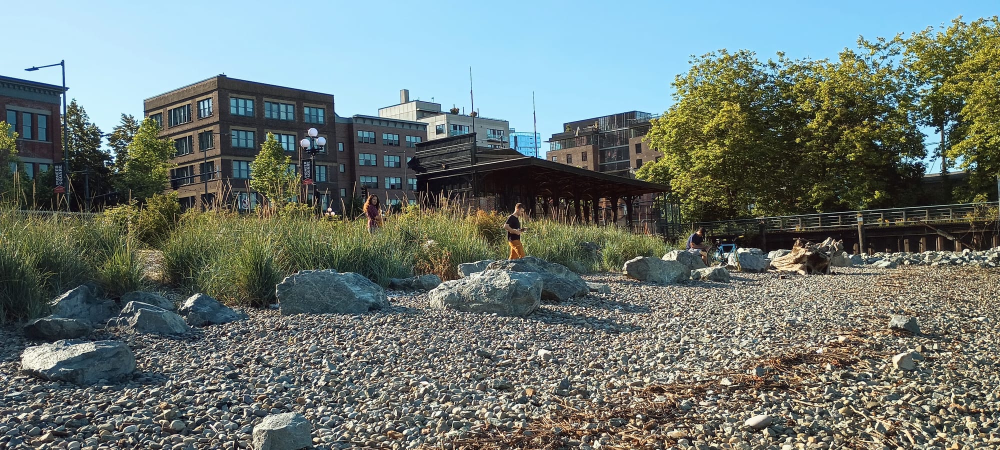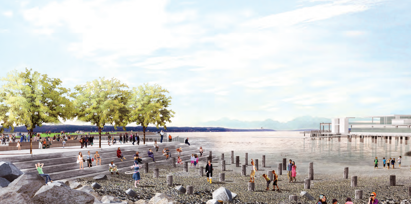 This weekend, Seattle’s Office of the Waterfront quietly opened a stretch of rocky beach in Pioneer Square, just south of Colman Dock. The small parcel of waterfront, which has been sitting behind a fence for more than two years so that the plants could fully develop in the space, is the first new direct downtown access to Elliott Bay in over a decade. Its opening to the public is one more sign that Seattle’s redevelopment of the central waterfront is nearing completion. But the new patch of public space comes just as the city announces the potential for future expansion of public space nearby.