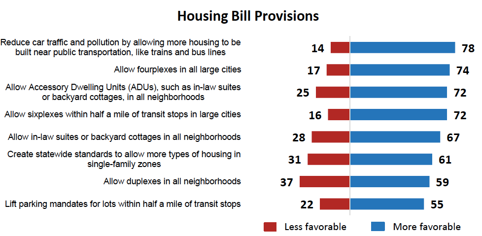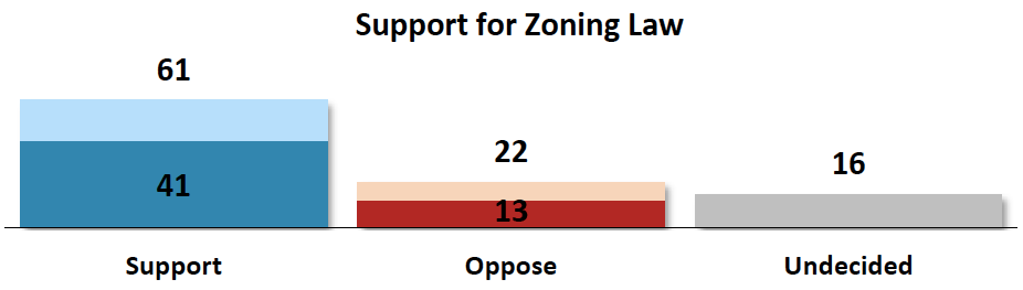 To test out the popularity of statewide legislation, the pollsters created an example missing middle zoning law and presented it to the poll participants. As mentioned earlier, the zoning law was popular with 61% of respondents expressing support and 41% of respondents express “strong support.”