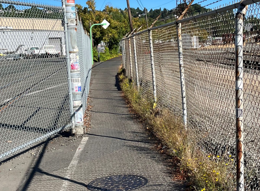 Open since 1987, the T91 trail is wedged in between Port property and the BNSF railyard, and about ten-feet wide along most of its length but existing rail infrastructure prompted some fairly big concessions to the trail’s design, most notably a bridge barely wide enough for two people biking to pass side-by-side that blocks visibility of any other trail users coming up the other side. That bridge was originally created so that vehicles could directly access rail cars without disrupting trail users, work that no longer occurs. The trail features another pinch point to the south that’s at-grade but similarly narrow. Both segments have signage directing people on bikes to dismount, though compliance with that rule is low.