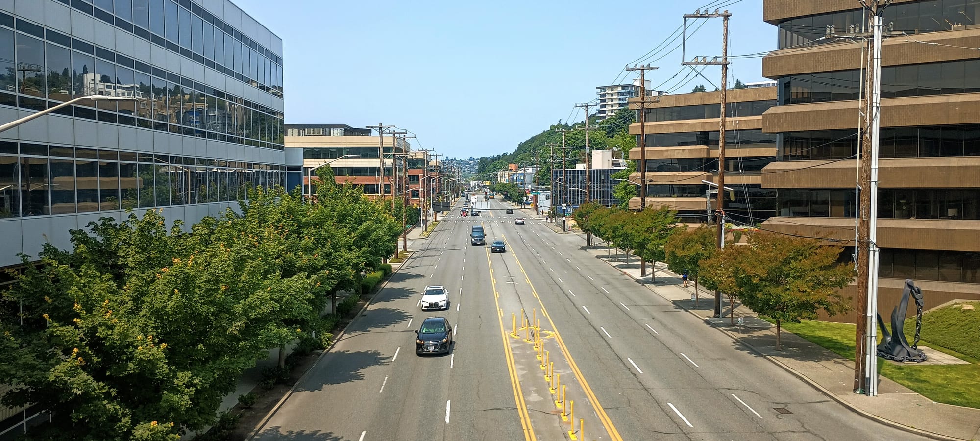 The Elliott Bay Trail is set to remain one of the easiest ways for people who walk and bike to connect between Magnolia, Interbay, and downtown, primarily due to the City of Seattle’s reluctance to make space on the main transportation corridors through the area, Elliott Avenue W and 15th Avenue W. The draft version of Seattle’s 20-year Transportation Plan, released in late August, doesn’t identify the corridor as an appropriate place to add bike infrastructure, despite the significant street space available to reallocate. Sidewalks on the street are also fairly narrow for a street that hosts a RapidRide bus (the D Line), when 18-foot sidewalks are the standard in the city’s guidelines.