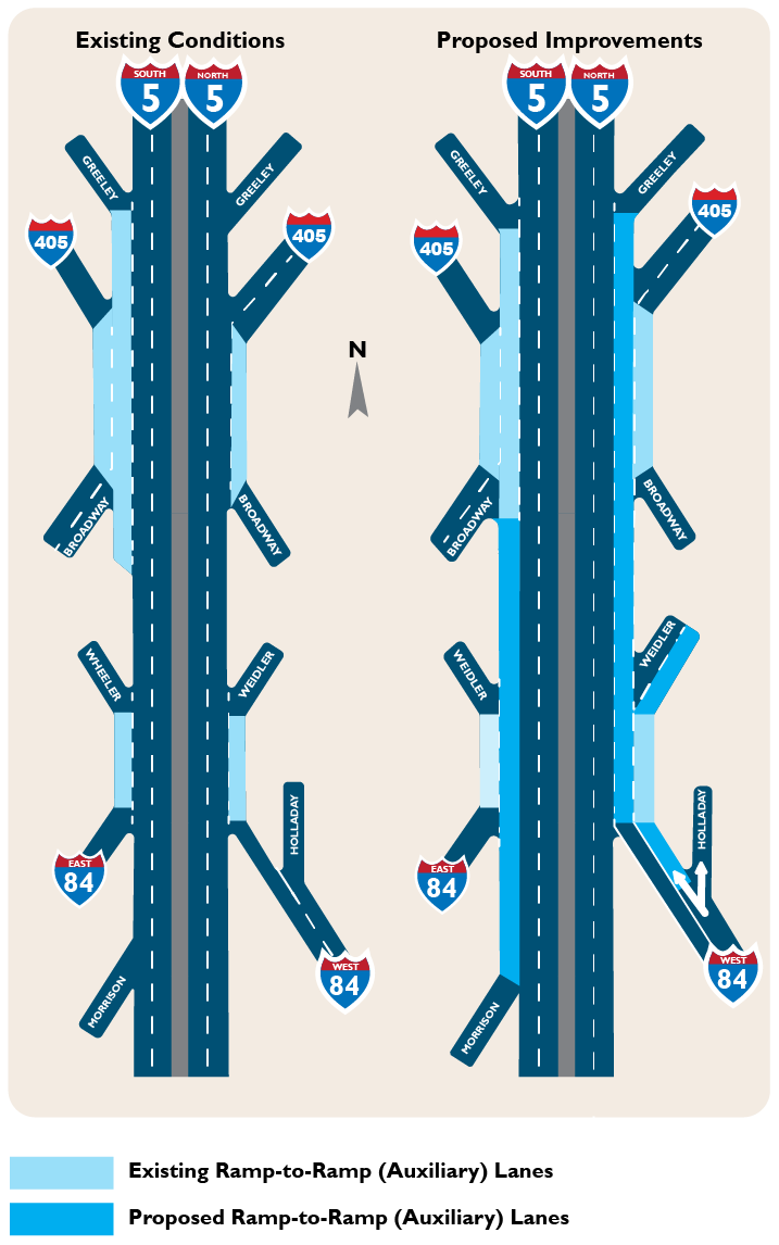 That fight may be be reappearing on the horizon, but not before Portland addresses a challenge that is entirely within its borders. The Oregon State Department of Transportation is eyeing a segment of I-5 between interstate 84 and Interstate 405 where traffic merges onto I-5, which it says currently experiences the worst bottlenecking in the state as a result. It’s proposing adding lanes to the entire segment, widening I-5 through Portland’s Rose Quarter district by framing the additional lanes as “auxiliary” lanes that are intended to improve safety and reduce “predictable” congestion.
