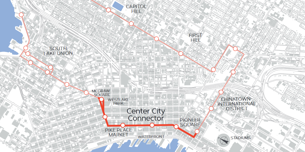 The Center City streetcar extension is planned to run on First Avenue primarily in exclusive transit lanes, but the existing First Hill Streetcar and South Lake Union Streetcar run in mixed traffic for significant portions — although the City could create transit-only restrictions if it so chose.