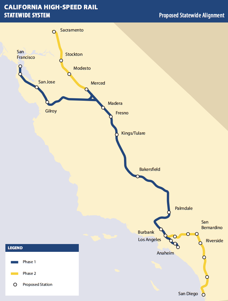 The Golden State meanwhile is forging ahead with California High Speed Rail, a plan to connect Los Angeles to San Francisco with 220 mile per hour service by 2029–that measure won $40 billion in funding via a state ballot measure passed in 2008. California could potentially use some help covering costs, which had ballooned to $64 billion by last count. When finished, the high speed line would provide two hour and 40 minute trips from Union Station in Downtown Los Angeles to Downtown San Francisco–faster than flying, which requires transferring to another mode to reach downtown.