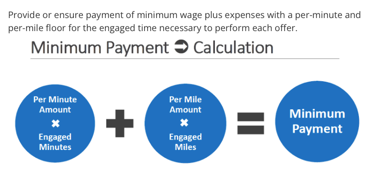 So far, only the first policy point has been finalized and made public. In the proposed legislation, app-based workers would have the right to earn a minimum payment that equates to minimum wage. The payment would be set by two factors: a per minute compensation in which engaged minutes would be compensated and a per mile amount in which miles traveled would be compensated as well. Since ridehailing and delivery drivers spend so much time in the car to and from gigs, this is crucial.
