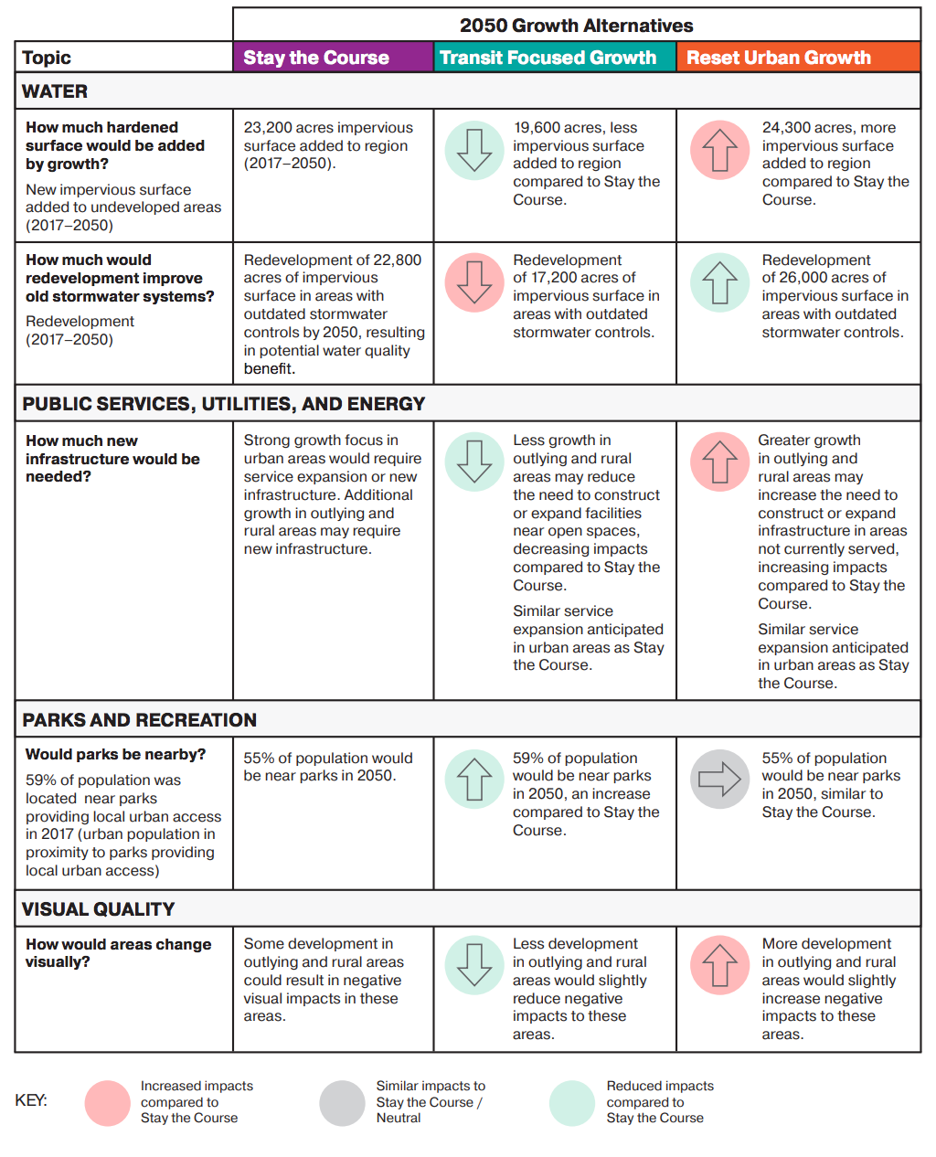 Each of the alternatives comes with positive and negative impacts. The “Stay the Course” alternative is considered to be the baseline from which the other two alternatives are evaluated against. Generally speaking, the “Transit Focused Growth” performs better in most topic areas, except for displacement risk and improvement of old stormwater systems.
