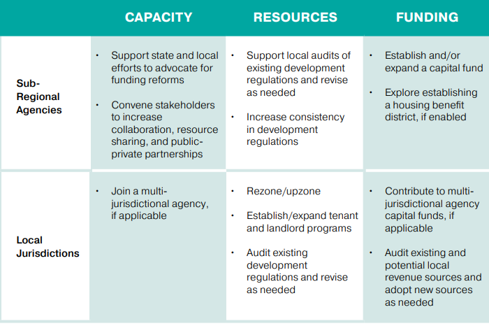 PSRC also put together a chart of what each level of government can do to meet the region’s housing and affordability needs. The chart follows: