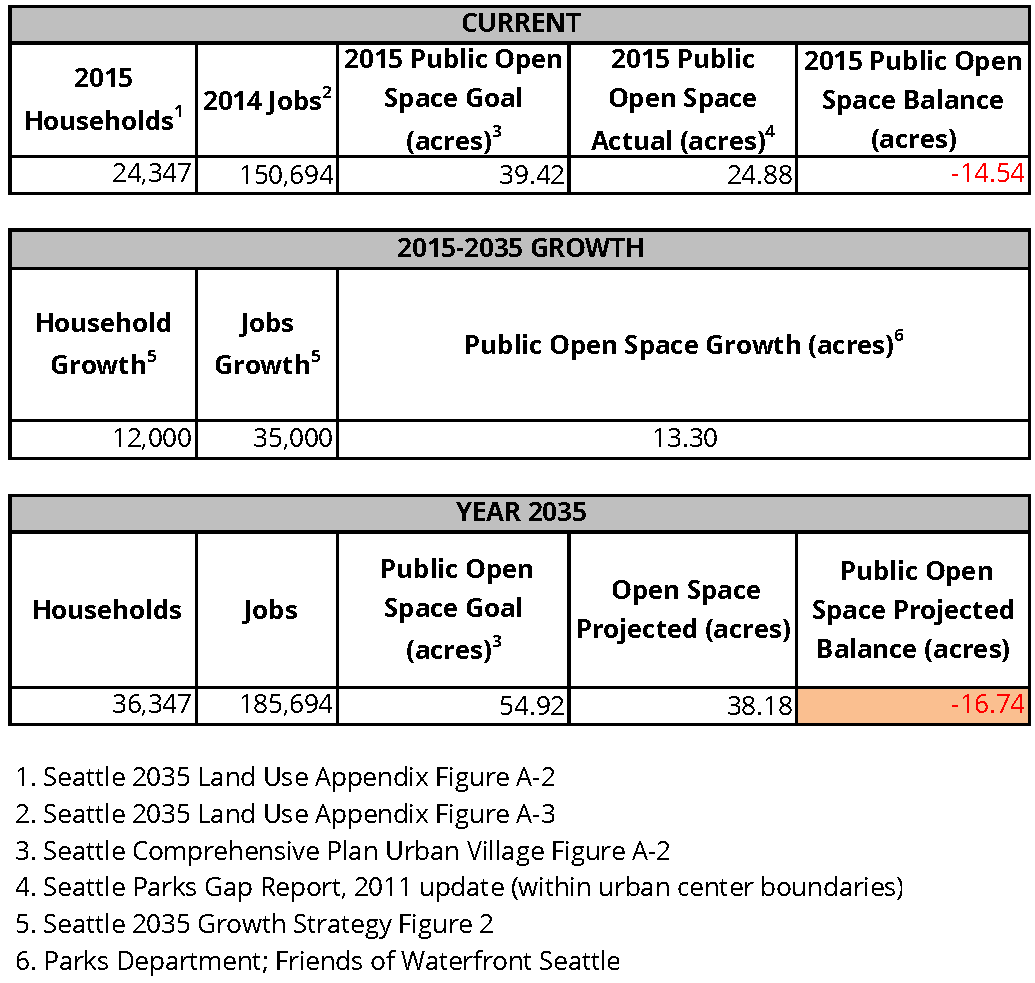 How much and what kind of park space a city needs is debatable and can be measured in many ways, but Seattle does offer a starting point: for decades the Comprehensive Plan established quantitative goals for urban centers and urban villages. In the 2005 version, the urban centers goal was one acre of “usable open space” per 1,000 households and one acre per 10,000 jobs. “Usable” is defined as at least 10,000 square feet in area and in public ownership.