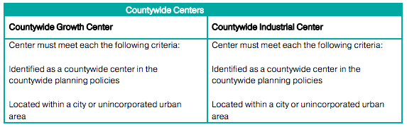 Various centers in counties may be of very high local importance. In recognition, the PSRC will allow counties to design Countywide Centers if they meet certain elegibility criteria. The criteria is different for Countywide Growth Centers and Countywide Industrial Centers. Counties will be responsible for processing designations and then submitting them to the PSRC for formal designation on the Regional Growth Strategy map. The eligibility criteria is outlined in the following table: