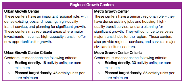 Under the new framework, Regional Growth Centers will come in two flavors: Urban Growth Centers and Metro Growth Centers. The bar to qualify for Metro Growth Centers is much higher since these are expected to function as very productive areas such as Downtown Seattle and Downtown Bellevue. There are several factors to designate an area as either type of RGC, such as existing and planned densities, mix of uses, geographic size, market potential and role, and access to planned and existing transit: