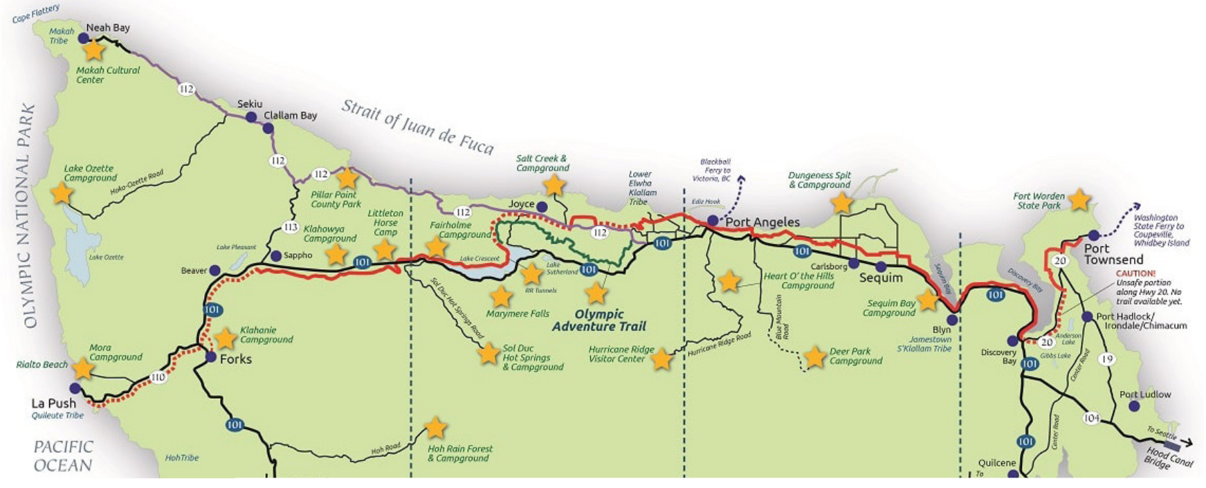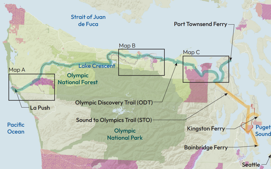 The Puget Sound to Pacific Trail builds on the existing 135-mile-long Olympic Discovery Trail between Port Townsend and La Push, and the driving organization behind its development for the past 35 years is the Peninsula Trails Coalition – a key advocate for the application of this grant. The ultimate vision of this new Puget Sound to Pacific Trail is a full connection between two multi-use trails, the Olympic Discovery Trail – which currently has segments totaling 90 miles of completed trail across the north Olympic Peninsula, and the Sound to Olympics Trail, which exists as two short segments of trail in Kitsap County.
