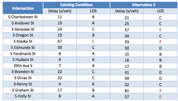 The traffic study confirms that Level of Service, the outdated measure of travel delay on an A to F scale, is one of the main factors that lead to the department’s conclusion. According to the engineering study, alternative 1 would only result in a minimal degradation of vehicle times. The report states: “all the half signals would operate at LOS B or better and all the full signals would operate at LOS C or better. The intersection that would experience the highest increase in delay is S Othello St where the delay would increase by 34 seconds per vehicle resulting in a degradation of LOS from B to D”. On the other hand, “While the Alternative 2 configuration would have a slight impact on northbound GP traffic operations, its impact on the southbound general purpose traffic operations would be substantial. This substantial increase in corridor travel time is largely attributed to a combination of factors such as roadway capacity reduction from the rechannelization configuration and bus blockages introduced by in-lane bus operations.”