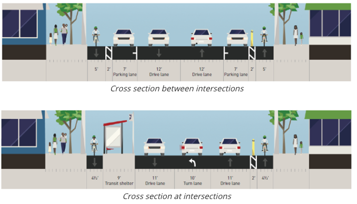 Alternative 2 would add a protected bike lane along the corridor in both directions, four and a half feet wide, with one travel lane remaining in both directions. At bus stops, transit islands would be constructed. In between stops, because there isn’t enough remaining space for another travel lane or bus lane, parking would be added where currently there is none.