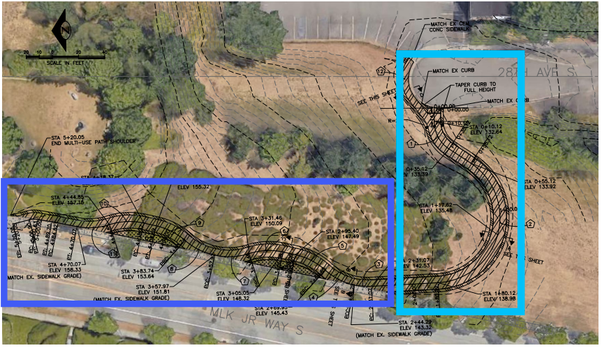 The issue eventually worked its way up through the agency to Barb Chamberlain, director of active transportation at WSDOT. Following a site visit in 2019, a way forward was found: instead of a direct connection to the I-90 trail, a shorter connection to the sidewalk on MLK Jr Way S. “On our walk-through we identified a possible alternative for you to consider: A short connection to the sidewalk from the end of 28th would likely be something we could say yes to,” Chamberlain wrote that year. “If you were to approach this as a widening of the sidewalk that wouldn’t be a new trail.” By 2021, that idea was turned into a full design.