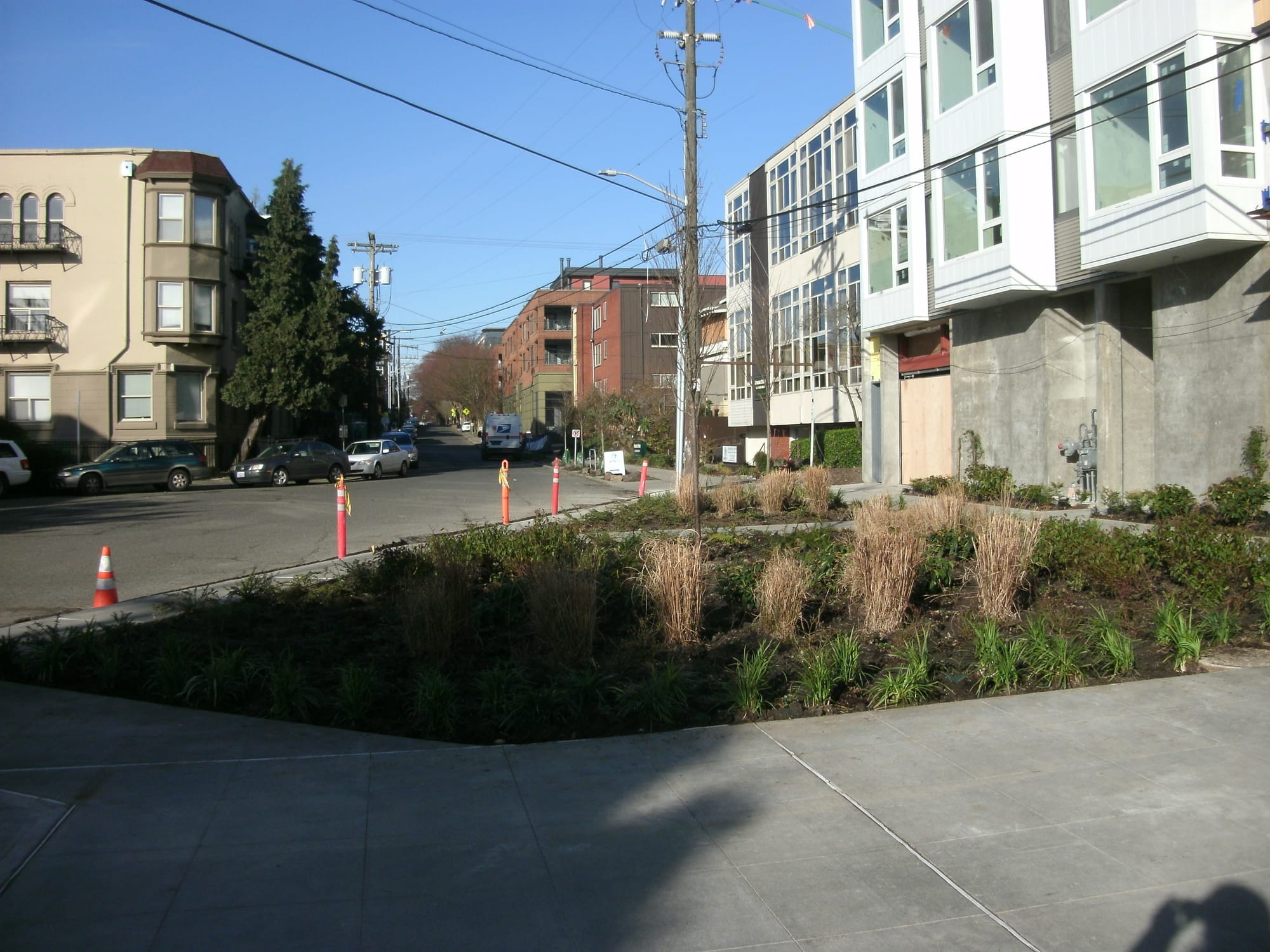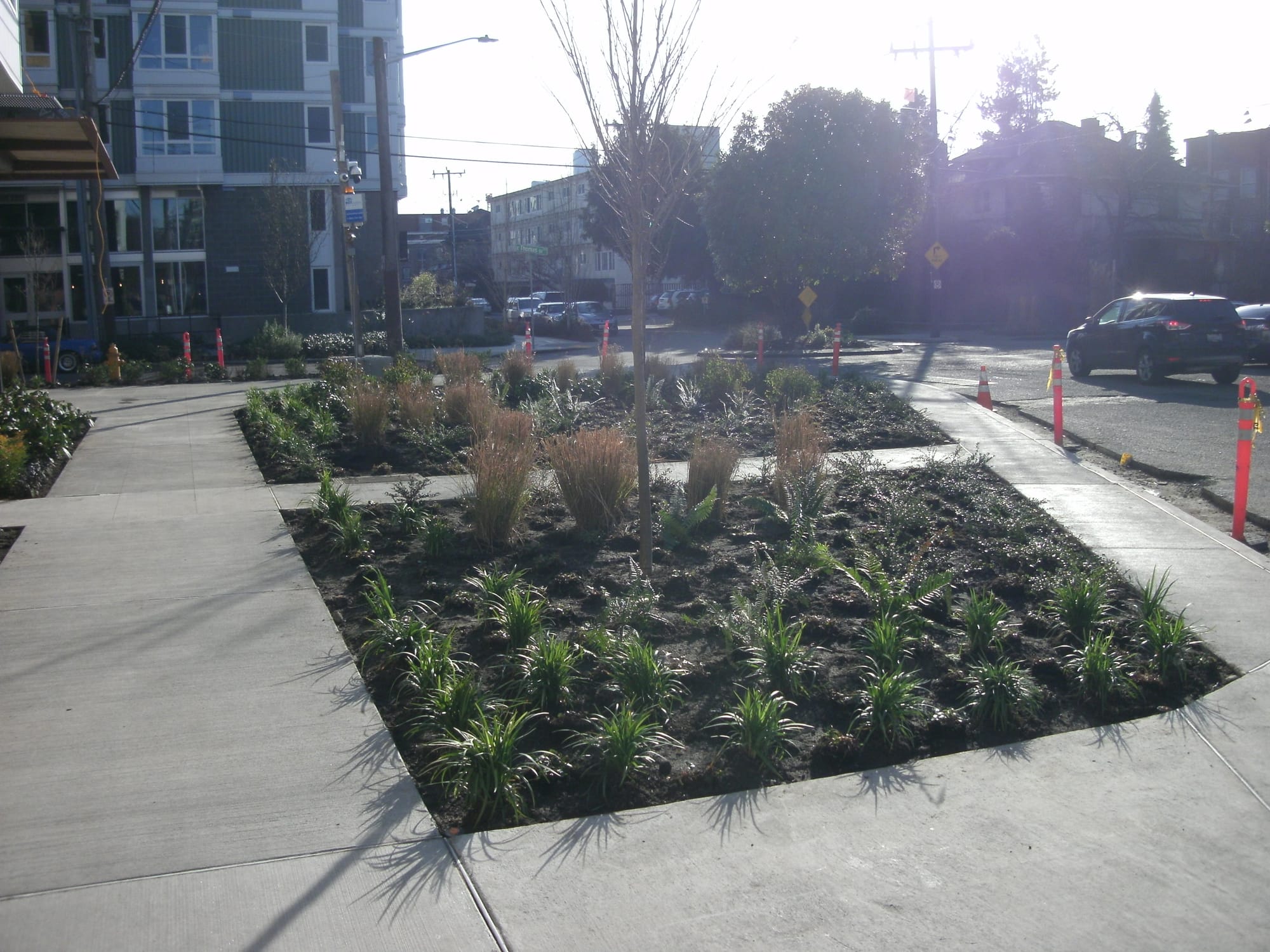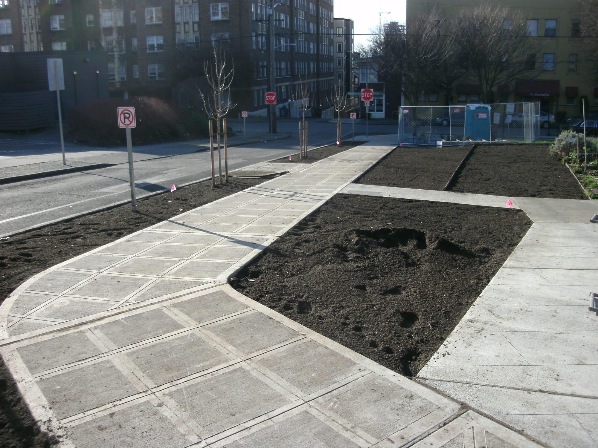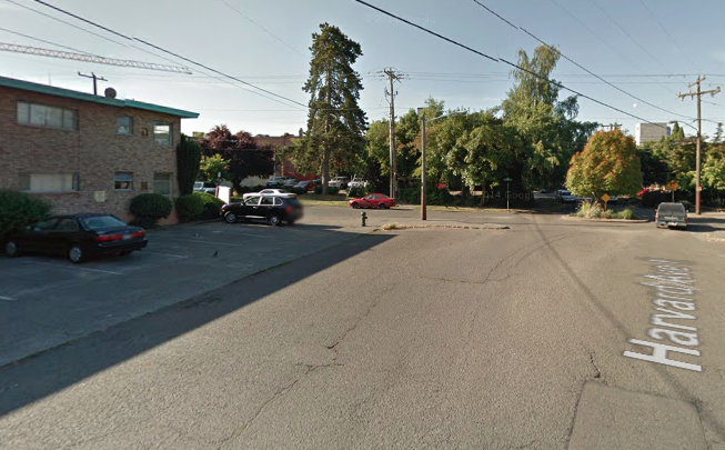 A little ways up the hill, at Harvard Ave E and E Thomas St, another reclamation of street space just took place with the forthcoming opening of the Harvard Apartments. Thomas and Harvard has always been a very odd intersection, as far back as 1892, as Capitol Hill historian Rob Ketcherside documents thoroughly in this article for Capitol Hill Seattle. As he lays out, a large expanse of street there is the result of two different plats that came together to form our current street grid. It was probably home to Seattle’s first pavement park, right in the middle of the street, until the city could no longer afford to maintain it and it was paved over sometime between 1946 and 1960.
