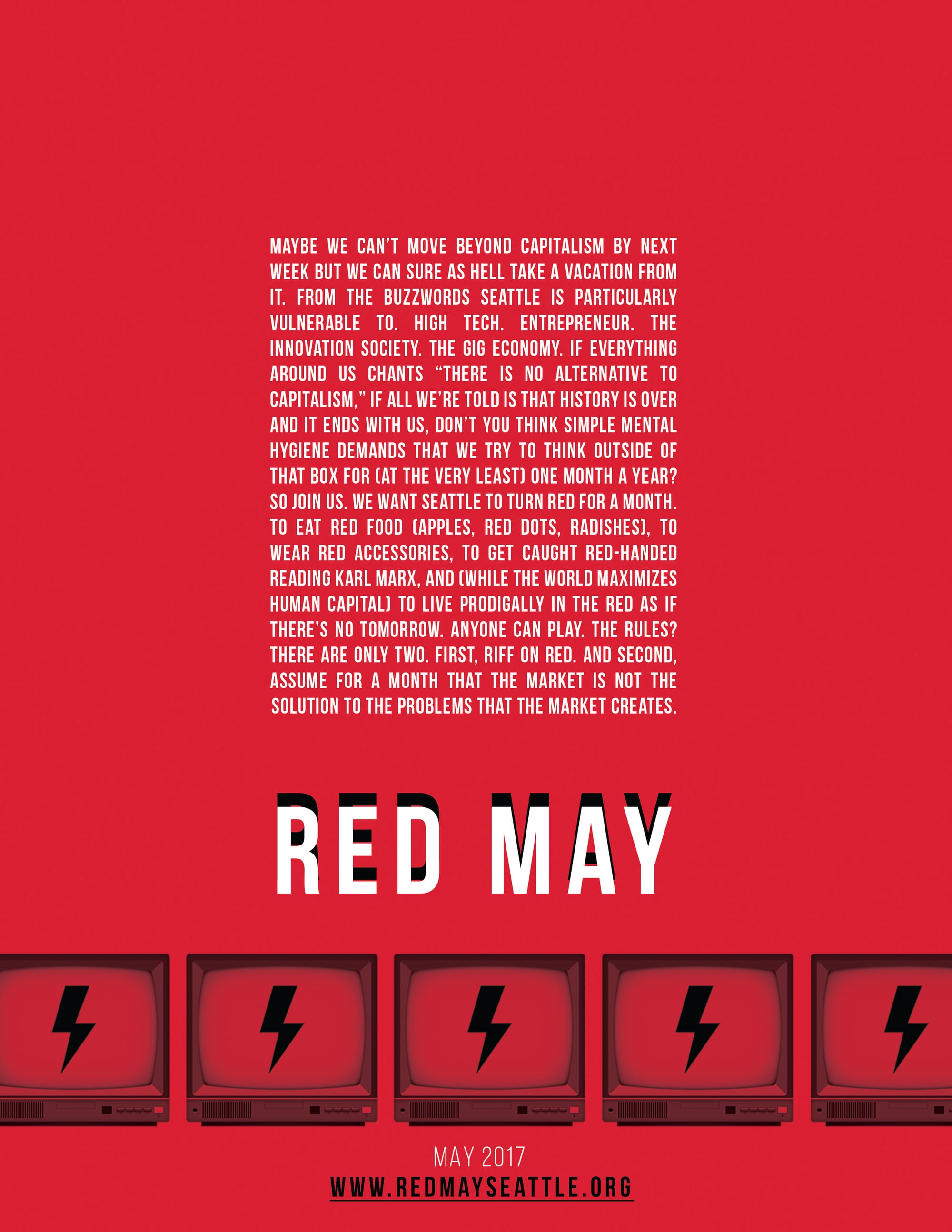 We want Seattle to turn red for a month. To eat red food (apples, red dots, radishes), to wear red accessories, to get caught red-handed reading Karl Marx, and (while the world maximizes human capital) to live prodigally in the red as if there’s no tomorrow. Anyone can play. The rules? There are only two. First, riff on red.