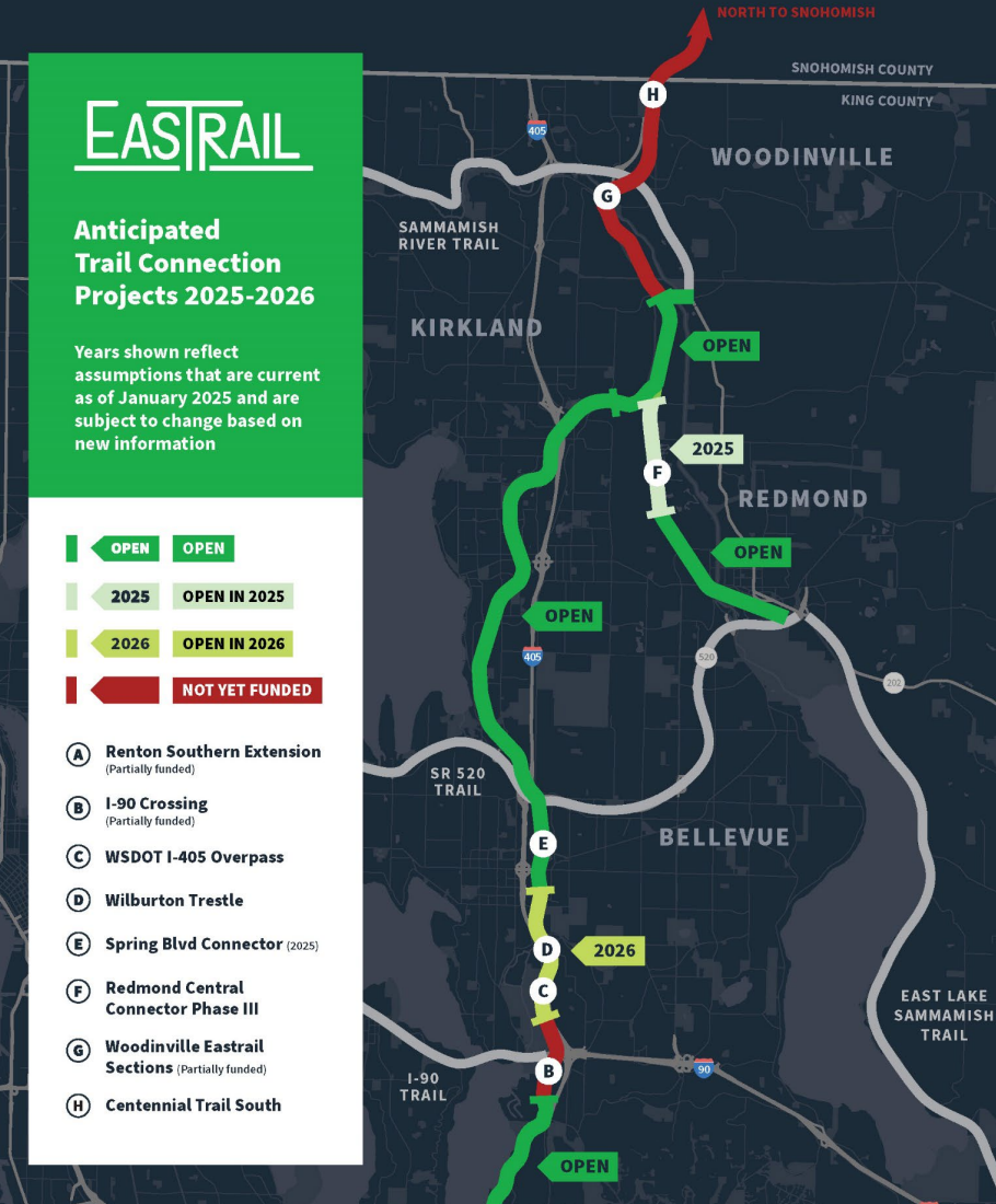 With a direct connection to Eastrail, Redmond is well positioned to benefit from the planned extensions of that county-led regional walking and biking highway that are set to come online in the coming years, including connections across I-90 that will finally bridge Renton with the central Eastside, and a northern extension of Eastrail through Woodinville up into Snohomish County.
