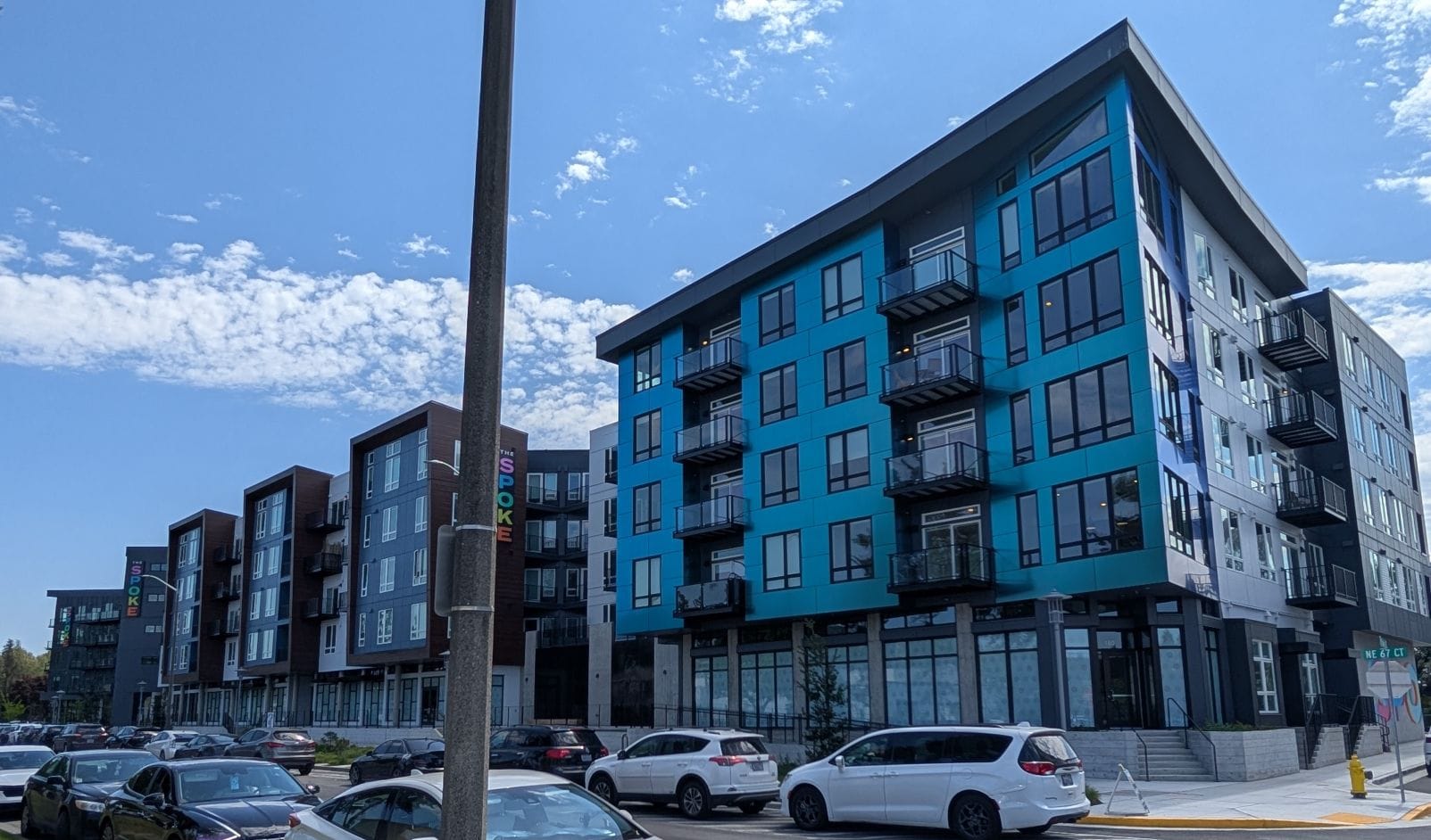 The first of the newest multifamily cluster, Spectra at Marymoor (17620 NE 69th Court) is a large mixed-use complex spread across three five to six-story buildings. Separated by pedestrian pathways, the three buildings contain 450 residential units, 15,285 square feet of retail space, and 515 parking stalls. The project was completed in phases across 2022 and 2023.