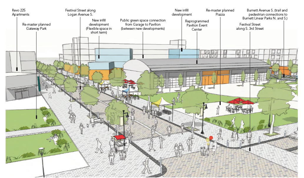 The Piazza would also become the focal point of a new multimodal trail connecting the existing Burnett Avenue Linear Parks to the north and south. This will provide continuous protected bicycle and pedestrian infrastructure through the neighborhood while linking the residential neighborhoods around downtown with new green space.