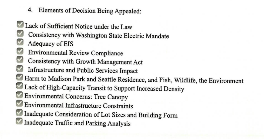 As is custom in predatory delay, the appeals use an everything-but-the-kitchen-sink strategy, citing a variety of potential impacts covered under the State Environmental Policy Act (SEPA) that they allege the City didn’t consider deeply enough. Those include a purported lack of stormwater infrastructure, lackluster transit service, tree canopy loss, on-street parking impacts, and an alleged harm to historic resources. Seattle’s Hearing Examiner will likely dismiss many of these issues, but the goal is getting one of them to stick, at least long enough to delay the plan’s implementation.