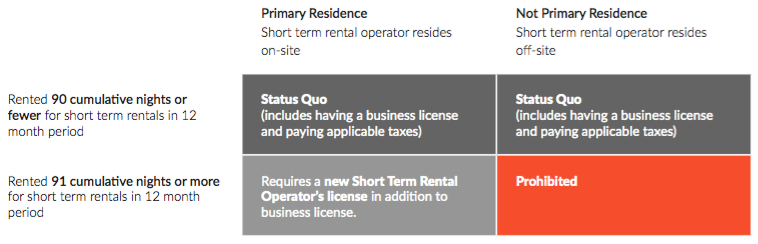 The revised legislation would require all short-term vacation rental operators to hold a license, but would eliminate the maximum number of days that a unit could be rented as a short-term vacation rental. The proposed legislation would also grandfather in some large-scale commercial short-term vacation rental businesses–which in some cases are effectively hotels–and cap the number of units that individual operators could run.