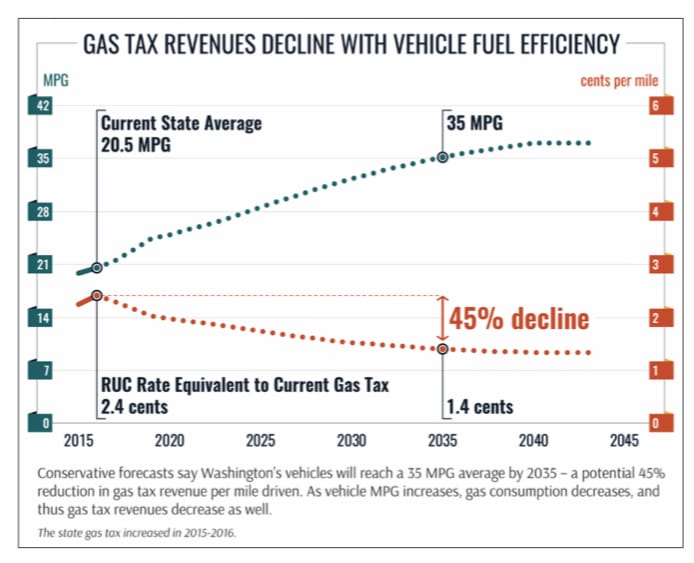 Washington is pursuing an RUC because the gas tax is unable to keep up with increased fuel efficiency of newer vehicles and widespread adoption of electric vehicles. As vehicles become more efficient, the gas tax must be increased to hold revenues at their intended levels since systemwide the average number of miles a car can go on a gallon increases.