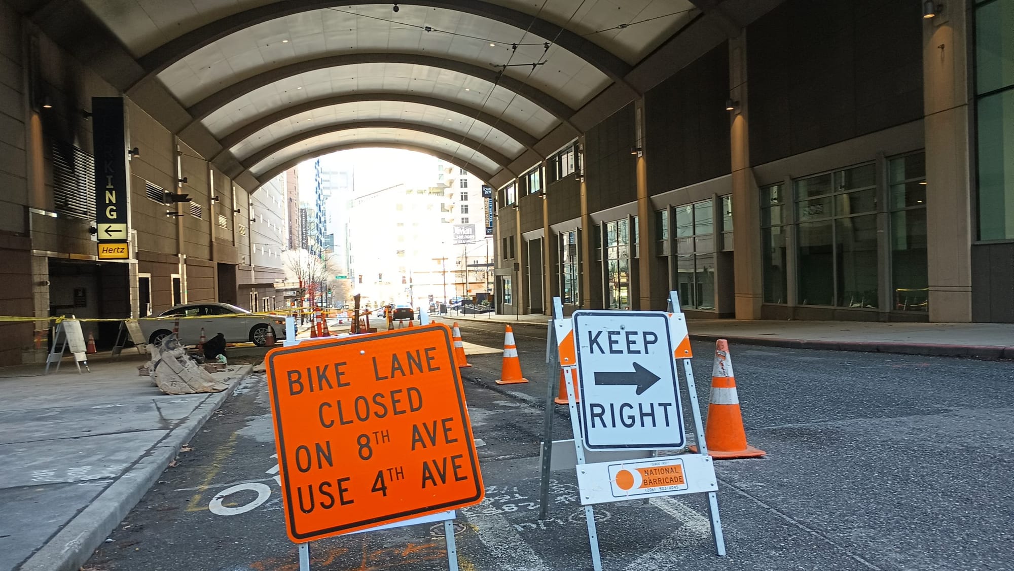 Unfortunately, the construction detour being provided here isn’t anything better than directing cyclists a full four blocks out of their way to 4th Avenue, an approach that will likely need to change. Detours for vehicle routes during construction are never so circuitous, but it’s considered standard practice to not create a temporary safe facility while another one is being upgraded, either in the case of a bike lane or a sidewalk.