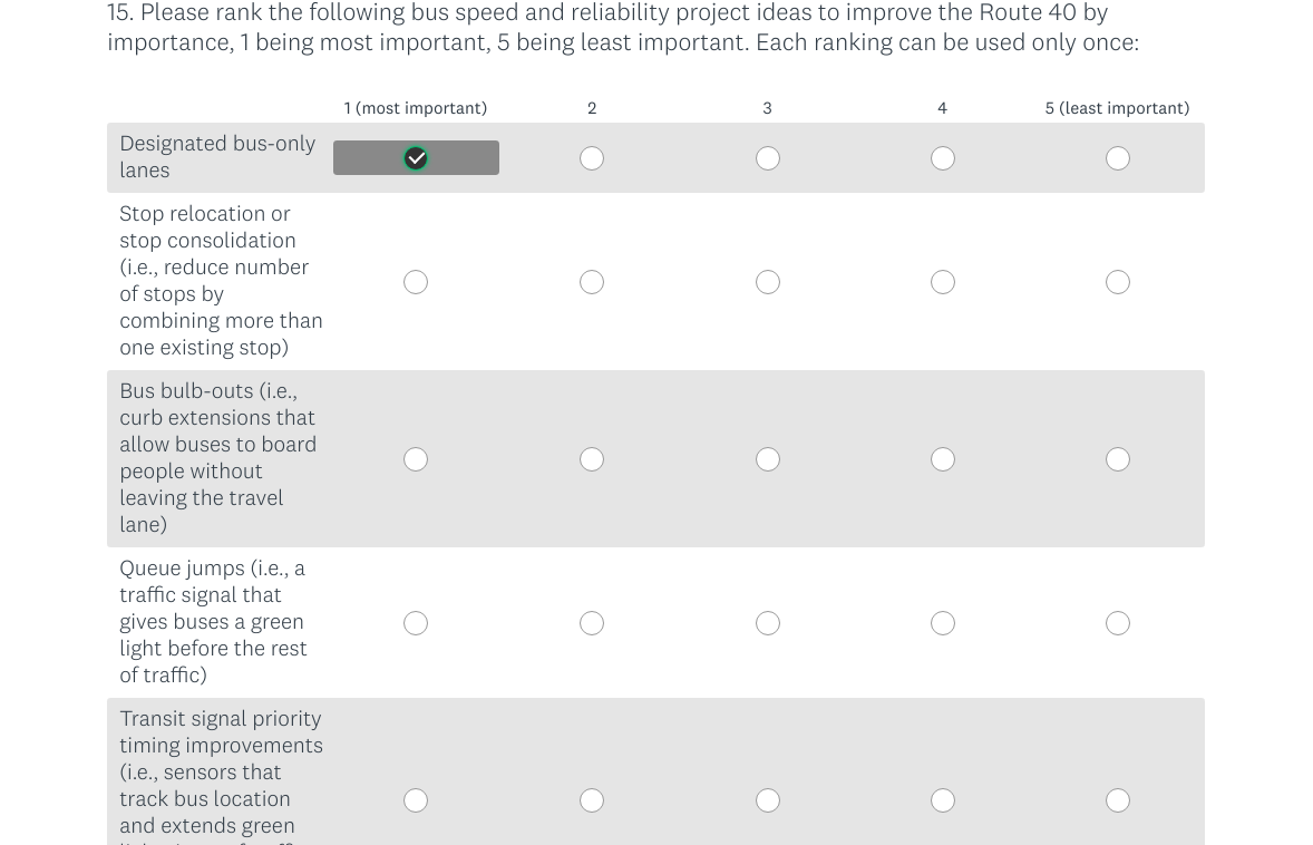 A few questions later, SDOT asks which bus improvements are the most important. All of the ideas–from stop consolidation to in-lane bus stops to queue jumps to transit signal priority–would be important but I’d argue bus lanes are the most important upgrade, particularly when paired with queue jumps and transit signal priority at problem intersections.