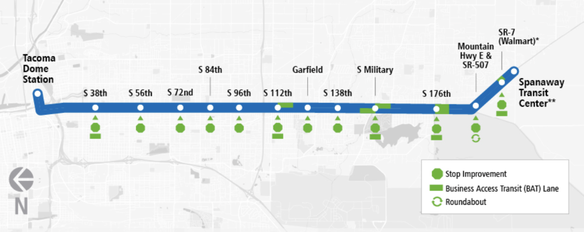 But Mello sees the scaled-back “enhanced bus” running between Tacoma Dome and Spanaway as providing a big benefit for riders, and provide a demonstration project that will lead to demand for more transit projects across the county. Ultimately, the enhanced bus service will function more like an express option for travelers looking to get from one end of the corridor to the other. “It’s not going to have all the elements that the community deserves for high-capacity transit… we need a lot more features to make that transit service quicker, more frequent, safer, more comfortable,” he said.