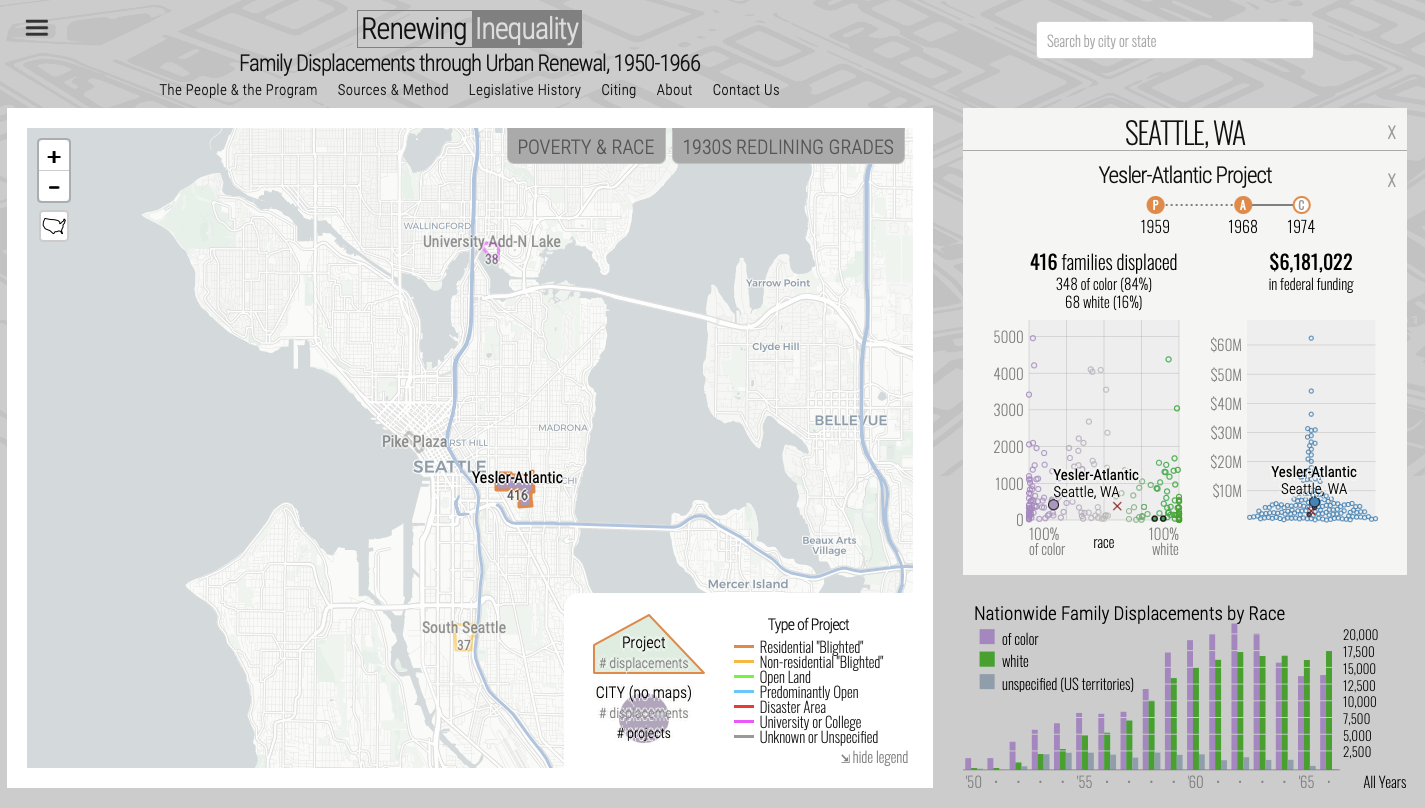 Like many American cities, Seattle engaged in urban renewal efforts with the financial backing of the Federal government between 1950 and 1966. According to research completed by the University of Richmond’s Renewing Inequality website, approximately $12.4 million was spent by the Federal government on three urban renewal projects in Seattle. These projects resulted in the displacement of 491 families, 73% of whom were people of color. The Yesler-Atlantic urban renewal project was by far the largest, spanning 340 acres in the present day Judkins Park, Mount Baker, and Central District neighborhoods. 416 families were displaced from the Yesler-Atlantic area alone, 84% of whom were people of color. Because of the disproportionate burden it placed on Black Americans, critics of the era referred to the practice of urban renewal as “negro removal,” a moniker that endures today.