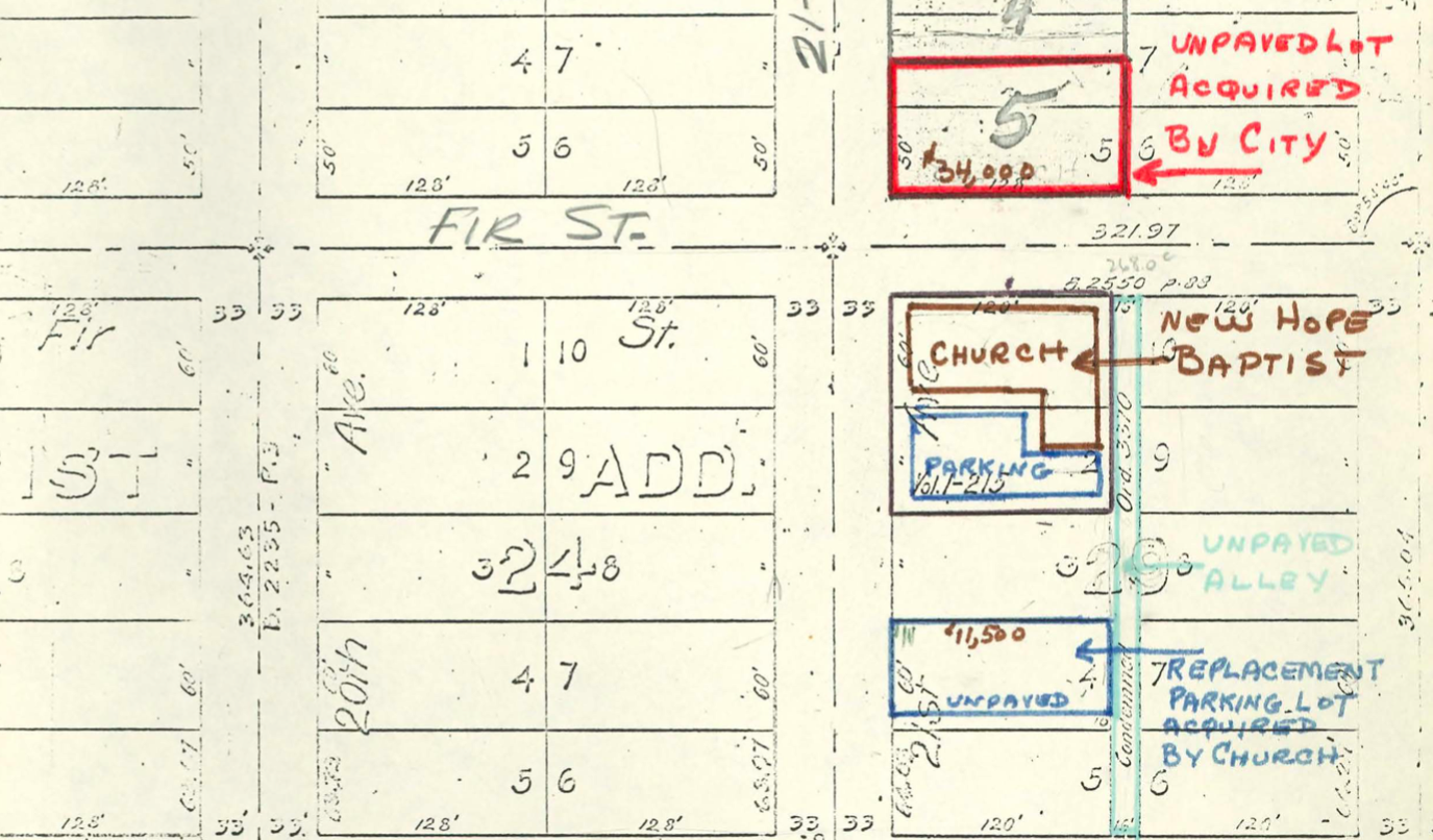 It is impossible to create a time capsule to go back and examine all of the circumstances that influenced New Hope Missionary Baptist Church to sell its land to the City in 1969, or to create an alternate timeline in which the church held on to the land and did not purchase the other parcel. However, the claim that this particular institution was shut out from the economic growth of the surrounding neighborhood invites questions.