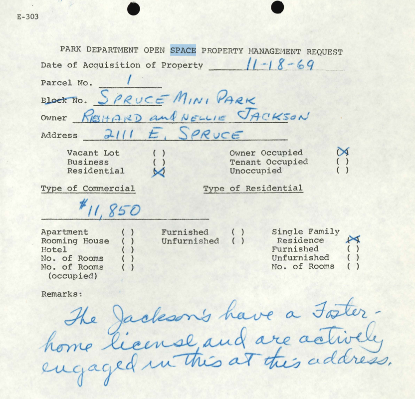 Some injustices are writ-large, like the case of the Yesler-Atlantic urban renewal project which displaced hundreds of families. Yet, sometimes it is the small examples that bring most vividly to life the hardships people have faced. Take for example, the case of Spruce Mini Park. About half of the park’s land is below street level, serving to help drain rainwater runoff away from the surrounding area, which includes a childcare center that has been in operation since 1963 and is separated from the park by a cement retaining wall. However, although never an ideal spot for buildings, before the land became a park, it was the site of people’s homes. One of the letters of acquisition from the City provides insight into past inhabitants, an “actively engaged” foster family, Richard and Nellie Jackson.