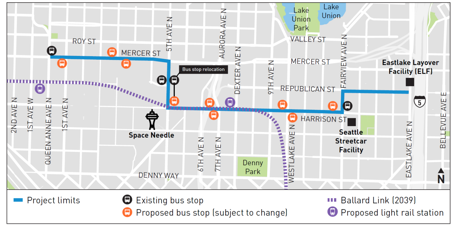As transit advocates continue to push for additional bus priority to speed up the often-delayed Route 8 on Denny Way, the Seattle Department of Transportation (SDOT) is advancing plans for dedicated bus lanes a few streets away. The Harrison and Mercer Transit Access Project, which would create a new transit pathway connecting South Lake Union and Uptown, continues to move forward as a priority project, in spite of no clear plan to move bus service onto the corridor.