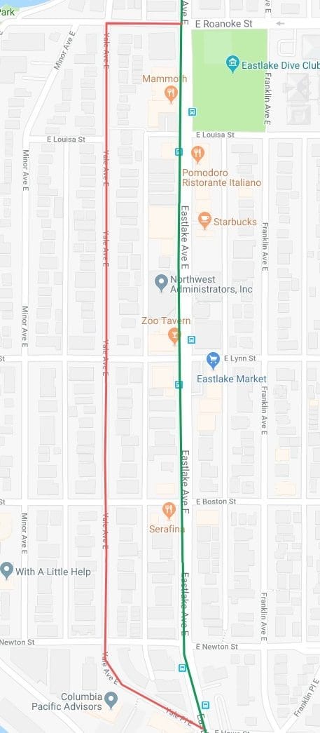 - Option 5: A one-way protected bike lane on Eastlake headed north, and a one-way protected bike lane two blocks away on Yale Ave E for riders heading southbound.