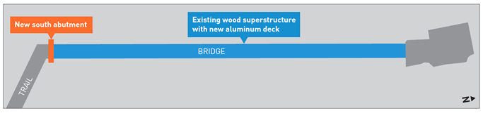 With so many competing bridge maintenance needs, the cheapest option is going to look pretty attractive. That option would consist of rehabilitating the existing bridge, keeping the superstructure but adding a new aluminum deck, widening the bridge from six feet to ten feet. But that wouldn’t make the bridge fully accessible, with the grade of the bridge still not meeting ADA standards. This new bridge would likely only last another 30 or 40 years, with frequent inspection and maintenance of the timber superstructure.