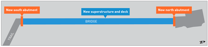 A second option would completely replace the superstructure, which would allow a replacement bridge to be widened to 14 feet. This still wouldn’t have an ADA-compliant grade. A new bridge would have an expected lifespan of 75 years.