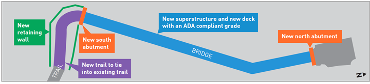 The third, and best, option would be to construct a new ADA-compliant bridge, which would require an extension of the trail, a retaining wall, and an angled bridge to handle a more gentle grade. This bridge would also be 14 feet wide. The primary downside to this option will be cost.