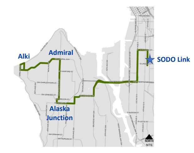 - Route 50 (Alki to SoDo via Admiral and Alaska Junction) — This route will see a doubling of frequency, from every 30 minutes to every 15 minutes on weekdays, 6am to 7pm. Just under half of the vested service hours (14,000) will go to bolstering this route.