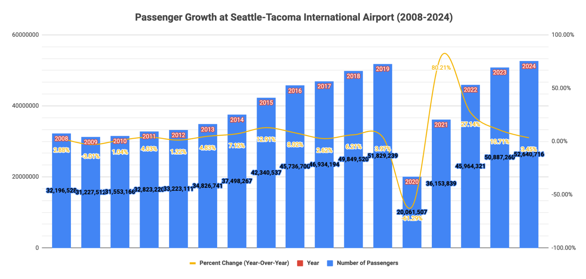Growth at Seattle-Tacoma International Airport (SEA) continues at a fast clip with new service, expanded and improved facilities, and booming passenger volumes. The airport has fully emerged from the pandemic period with a new record of 52.6 million passengers in 2024, besting 2019’s record of 51.8 million. Passenger volumes were up about 3.5% from 2023 despite the grounding of Boeing 737 MAX 9’s early in the year, due a midair door plug blowout.
