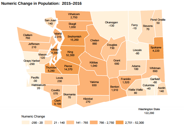 Housing supply tends to lag behind housing demand; it could be in the coming years supply finally approaches demand. About 10,000 apartments are set to open in 2017, and more than 12,000 more are slotted for 2018. At the very least, with record-setting apartment growth expected, we have ample reason to expect the population growth trend to continue. Since King County averages 1.8 people per apartment, we could see growth in excess of 20,000 per year continue a bit longer if those expected apartments are filled.