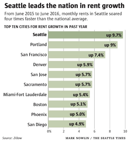 Of course there’s also the question: Did we grow our housing stock enough? Even setting a record for new units in 2015, prices still increased staggeringly. In July 2016, Mike Rosenberg reported on Zillow data that showed Seattle leading the nation in rent increases for the past year: